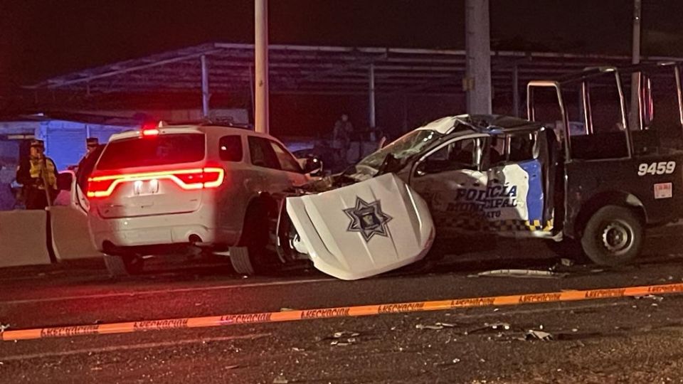 Mientras tanto, en la entrada a Irapuato ya se encontraba un operativo de control esperando a los agresores. Una patrulla de la Policía Municipal de Irapuato intentó maniobrar para detener el paso de los delincuentes y chocaron de frente, entre el carril izquierdo con dirección a la avenida Independencia y el muro de contención de concreto.