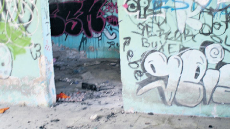 El edificio tiene dos pisos, los muros externos e internos están llenos de grafiti, las ventanas están rotas y la basura al interior que incluye animales muertos, genera un olor similar al del Relleno Sanitario.