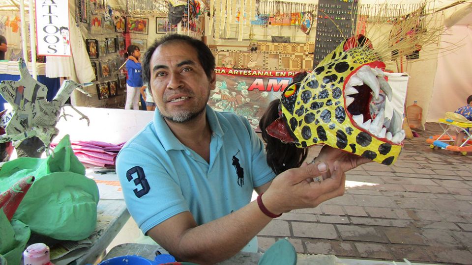 Alfonso Mendoza Cruz, aprovecha su estancia en esta ciudad junto a un grupo de artesanos oaxaqueños, para impartir talleres a niños y adultos sobre elaboración de alebrijes, máscaras, catrinas, mojigangas o marmotas.