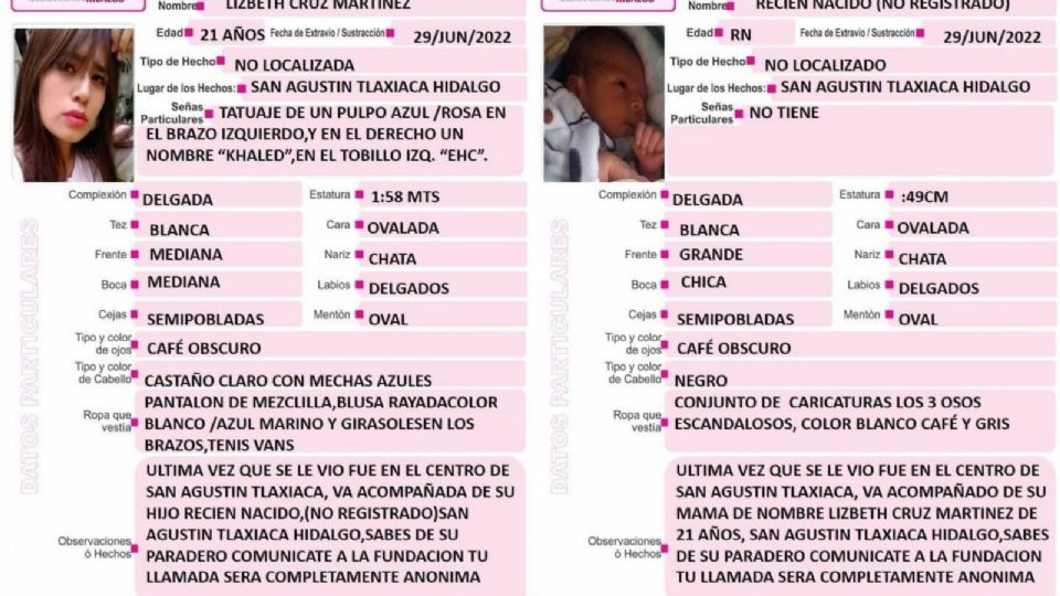 Publicado enZona Metropolitana Joven madre y su hijo recién nacido desaparecieron en San Agustín Tlaxiaca por Hidalgo Redacción 3 julio, 2022