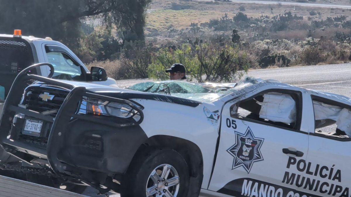 Una patrulla de la Policía Municipal de San Agustín Tlaxiaca terminó volcada sobre su toldo la mañana de este jueves.